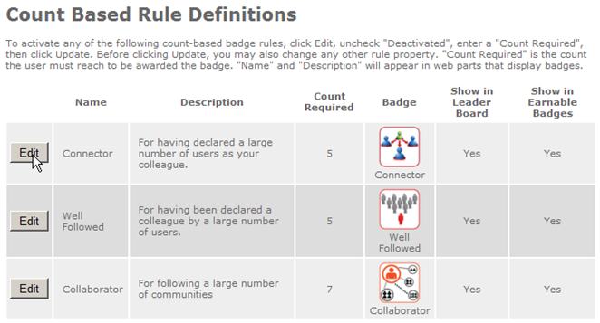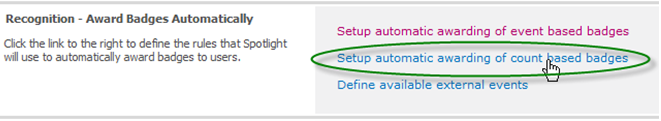 To activiate, go to the Spotlight Management page and click the new link in the Award Badges Automatically section, titled Setup automatic awarding of count-based badges.