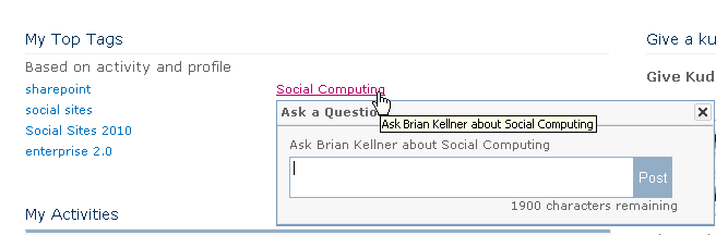 Visitors to another user’s profile page do not see these options. Instead, when a visitor clicks on one of these tags, they see a popup that allows them to ask that person a question about the topic represented by the tag, by just typing their question and clicking Post (see picture below).