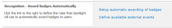 - In the Spotlight Management page, find the Recognition – Award Badges Automatically section and click the Define available external events link.