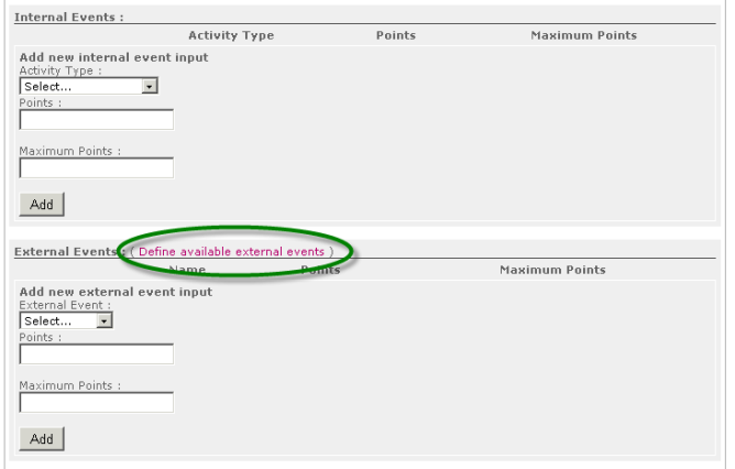 Click the Define available external events link in Recognition – Award Badges Automatically section