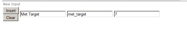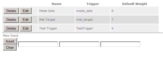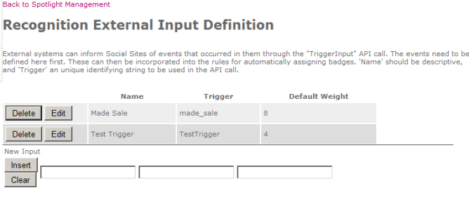 The inputs are in the same order as the listed definitions. From left to right, enter a friendly name that can be used to identify this input in UI displays; then the "Trigger", an internal name to be used by the external system when making the API call that tells Spotlight this event occurred; then the default weight to use for this input in scoring rules (administrators can choose a different weight when constructing the rules that use this input). When your entries are complete, click Insert.
