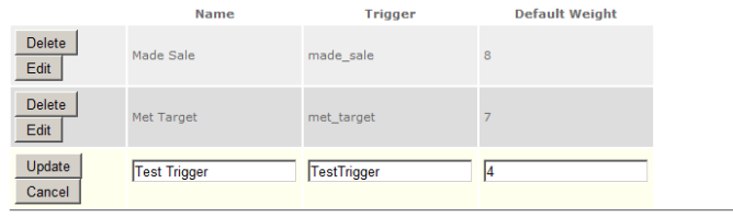 All the internal actions available for scoring are already listed on the Award Badges Automatically page. One can, however, call Aurea Social from an external system (such as a CRM system) to have actions occurring there counted toward Recognition scores. Before you can make the call from the external system, you need to identify in Aurea Social the types of actions that can occur in the external system. This amounts to providing an identifier, a descriptive name, and a default scoring weight.