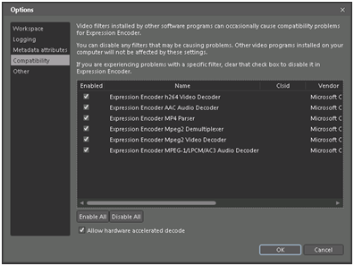• Make sure only the ones you really want are enabled for use by Expression Encoder.