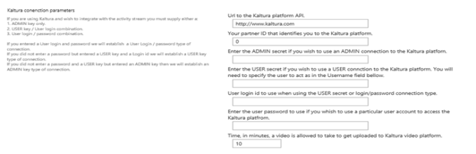 Kaltura connection parameters