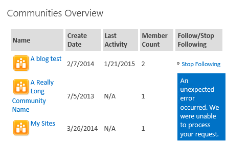 - Communities Overview: Communities are listed along with create date, last activity, member count, and a follow/stop following control as normal. If a user tries to use the follow or stop following control from this webpart, they see a brief message stating that “An unexpected error occurred. We were unable to process your request.”