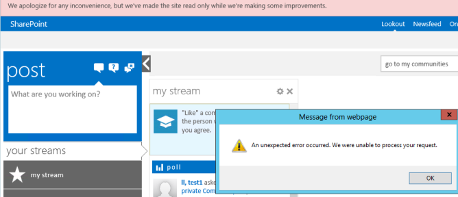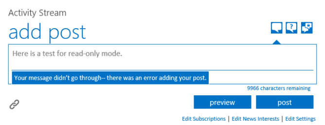 - Activity Stream: If a user tries to post, they receive a message that “Your message didn’t go through—there was an error adding your post.” Users can switch stream filters as usual.