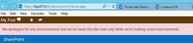 SharePoint displays a message to users in read-only sites “We apologize for the inconvenience, but we’ve made the site read only while we’re making some improvements.” This is an out of the box SharePoint message. You can read more about how a Sharepoint farm reacts to read-only here.