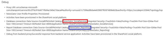 The NewsGator Social DB is outlined in red, and the reporting in indigo