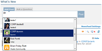 Microblog messages can be targeted at specific individuals, communities, or spheres. Typing the @ symbol in this box followed by a few characters of the user’s, community’s, or sphere’s name will cause a list of colleagues, communities and spheres that match the letters to be displayed.