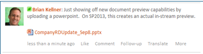 On SharePoint 2013 with Office Web Apps installed, an in-stream preview of the document is provided below the attachment link.