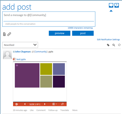 The user can then see how this will look by pressing the Preview button. This displays the post as it appears in the activity stream.
