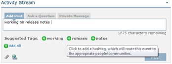 When the Hashtag Suggestions feature is enabled by your organization, users entering a post will receive a suggestion to convert a word they typed into a hashtag, when that word has previously been used by others in your organization as a hashtag.