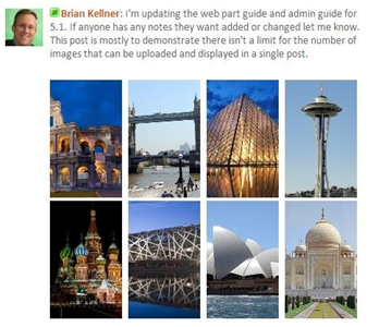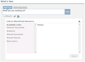 is available when creating posts, questions, comments, and answers. It expands a dialog box for a user to browse to files (by clicking the “Add Files” button) or to drag and drop files in, to be included as attachments to a post. If the user selects an image file, it will be uploaded to the Shared Pictures library and rendered in the activity stream.