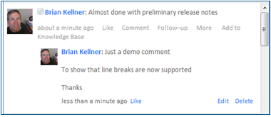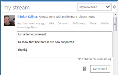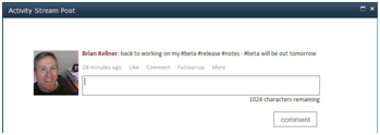 Users can click Like on a microblog entry in the activity stream to indicate positive feedback when they don’t have a comment to add. Clicking Comment allows them to post a response or add to the conversation. Either action causes the user to get notifications for any future likes or comments on that item.