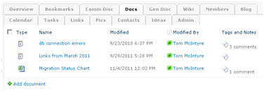 When the NewsGator Keywords feature is activated in a community, the tabular list displays in the community (for Documents, Wikis, Tasks, etc.) gain a Tags and Notes column.