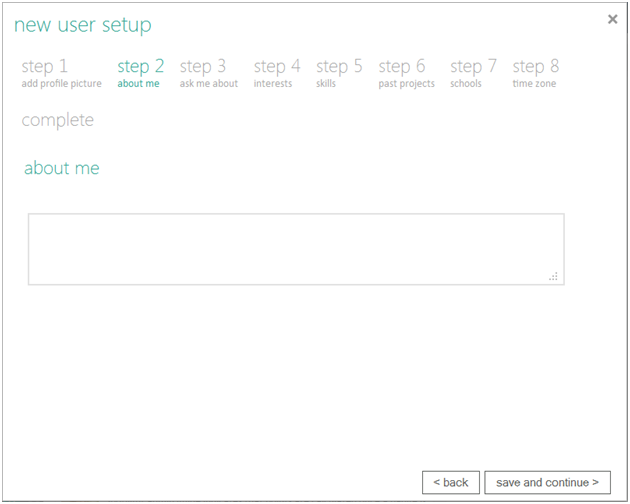 In this interface, all steps are required and have validation (except uploading the profile picture and setting time zone). Progress through steps is tracked and viewable on the reporting page.