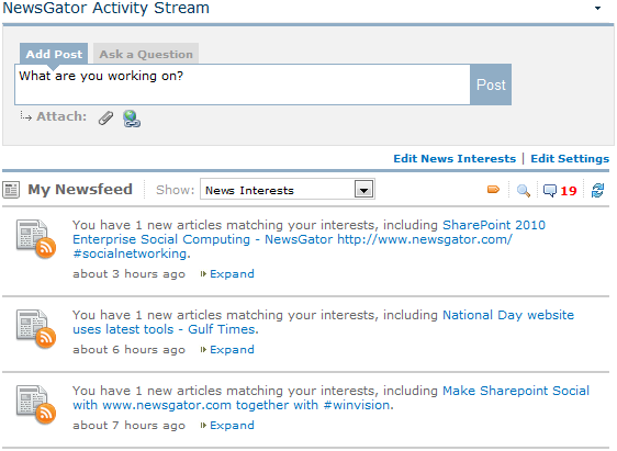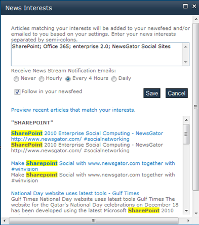 This they do via the Edit News Interests link in the Activity Stream web part, or via the News portion of the Settings dialog.