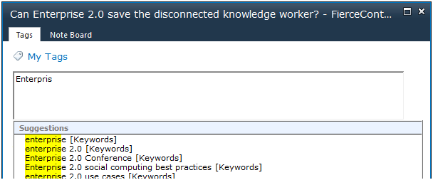 The Tag It link brings up the SharePoint control used for adding tags and notes to links. The story link is automatically selected, so the user simply enters a tag and/or a note. This SharePoint control supports auto- completion of tags as shown below.