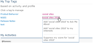 A user visiting his own profile page will therefore see the message Click a tag to manage in this web part. Clicking one of his areas of expertise shows a popup menu with up to three options, as appropriate: