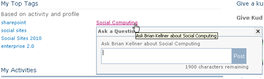 In the former case (pictured below right), you'll see a popup that allows you to ask that person a question about the topic represented by the tag by just typing your question and clicking Post.