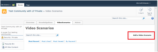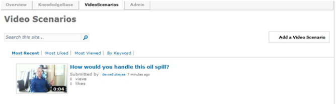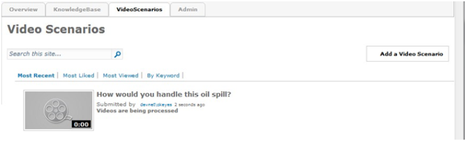 Go to the Video Scenarios tab to search and browse video senarios. Users can search for video scenarios and filter by most recent, most liked most viewed and by keyword.