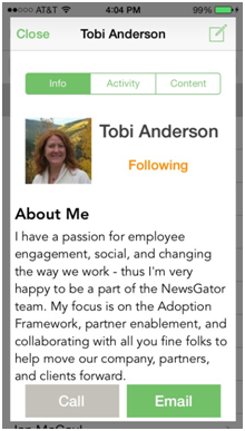 If you tap on a person, you are taken to a detail view page where you can see a person’s Info, Activity, and any Content that they’ve shared in Aurea Social.