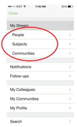 The Aurea Social app reflects how you have curated your experience. See below screenshot depicting the sidebar navigation, the tiles are “People,” “Subjects,” and “Communities”.