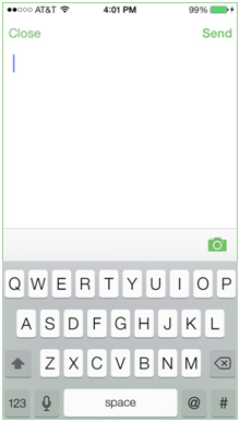 The Compose Message screen allows you to write microblogs and ask questions. You can add a photo to your message by tapping on the camera icon.