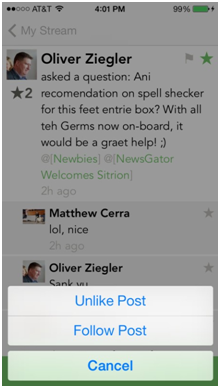 When you are viewing the detail page for a stream item, you can add it to your list of follow-ups by tapping on the flag. To like an item, you can tap on the star. Tapping either the flag or star again will toggle it off.