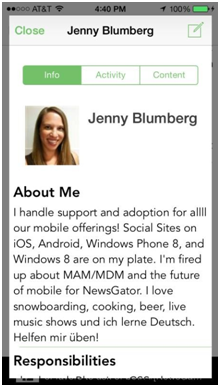 Your profile displays info that you’ve provided in Aurea Social, as well as your most recent activity and Content that you have shared, including documents and pictures.