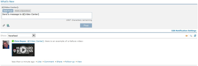 6. Click on the thumbnail and the video plays inline. The Kaltura video can then be viewed, commented-on and liked.